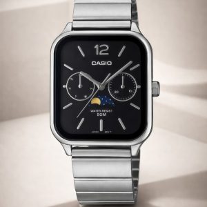 The Casio MTP-M305D-1A2 blends timeless style with practical functionality, featuring a sleek black dial with striking moon phase and calendar sub-dials. Housed in a durable stainless steel case and paired with a matching metal bracelet, this analog quartz watch is perfect for everyday wear and special occasions alike. With reliable timekeeping, day/date indicators, and 50-meter water resistance, it’s a versatile and stylish addition to any wrist.
