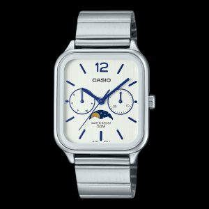 The Casio MTP-M305D-7A is a stylish stainless steel men’s watch featuring a clean white dial with multi-function sub-dials. Designed for everyday elegance, it offers reliable quartz accuracy, a durable metal bracelet, and a classic look suitable for both formal and casual wear.