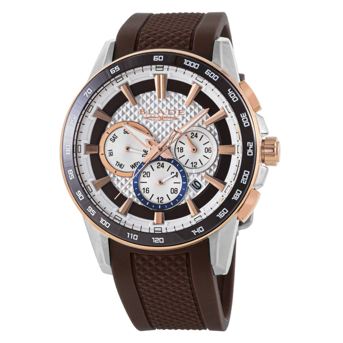 BLADE Impact Shell 3567G5USO – Falco Collection – Round – 44mm Stainless Steel Case – TT PVD Rose Gold Plating – Hardened Mineral Glass – Silver Dial – Dual-Time Multifunction Quartz Movement – 22mm Silicone Strap – Tang Buckle – 10ATM Water Resistant – Men’s Watch – 2 Years Warranty.
