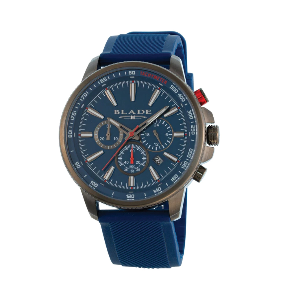 BLADE Verve Gun 3564G5ABB – Intrepid Collection – Round – 45mm Stainless Steel Case – PVD Gun Plating – Hardened Mineral Glass – Blue Dial – Japan Chronograph Quartz Movement – 22mm Blue Silicone Strap – Tang Buckle – 5ATM Water Resistant – Men’s Watch – 2 Years Warranty