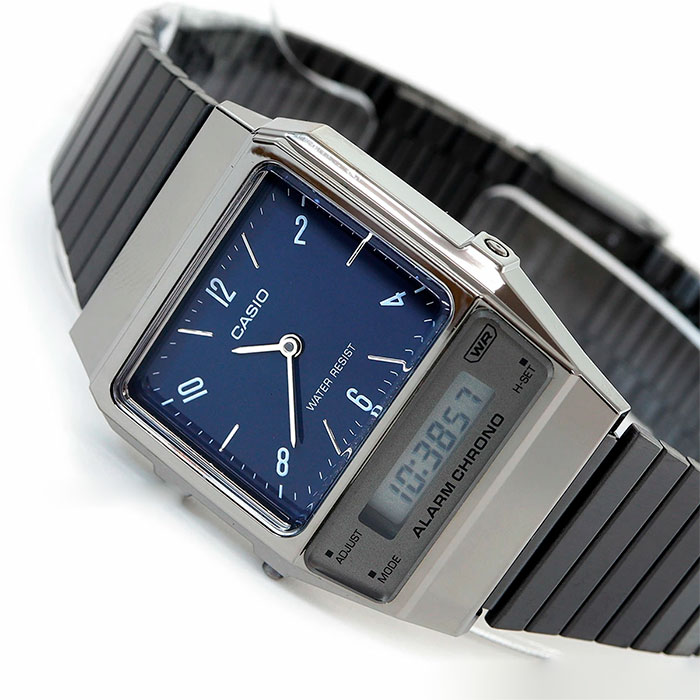 CASIO AQ-800EB-2A — A stylish retro-modern analog-digital watch that blends classic vintage charm with everyday functionality. Featuring a bold blue dial paired with a sleek metal bracelet, it offers dual time, stopwatch and alarm functions alongside a clear analog and digital display — perfect for daily wear with a timeless look.