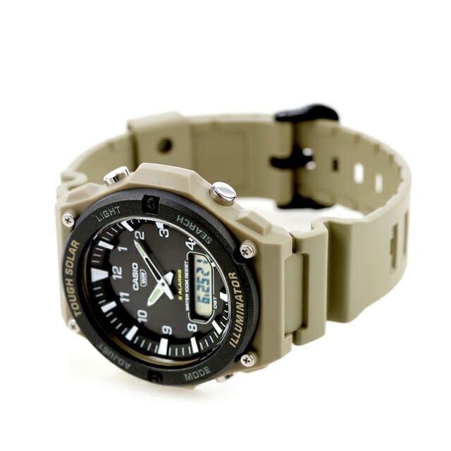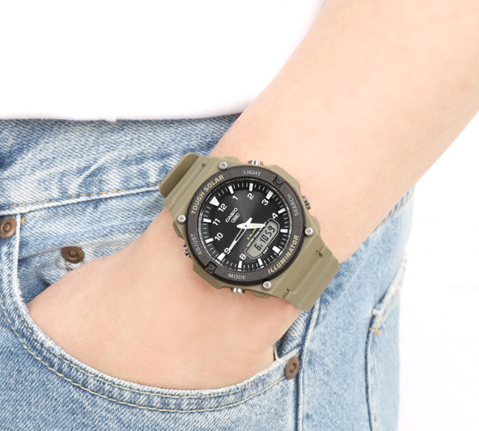 The CASIO AQ‑S820W‑5A is a rugged and reliable solar‑powered analog‑digital watch designed for everyday use and outdoor activities. Featuring a bold khaki resin band and a clear digital sub‑display this timepiece combines classic analog style with modern digital functionality. Its Tough Solar technology ensures long‑lasting power without battery changes, while practical features like world time, stopwatch, countdown timers, and alarms make it a great choice for travelers and active users alike.