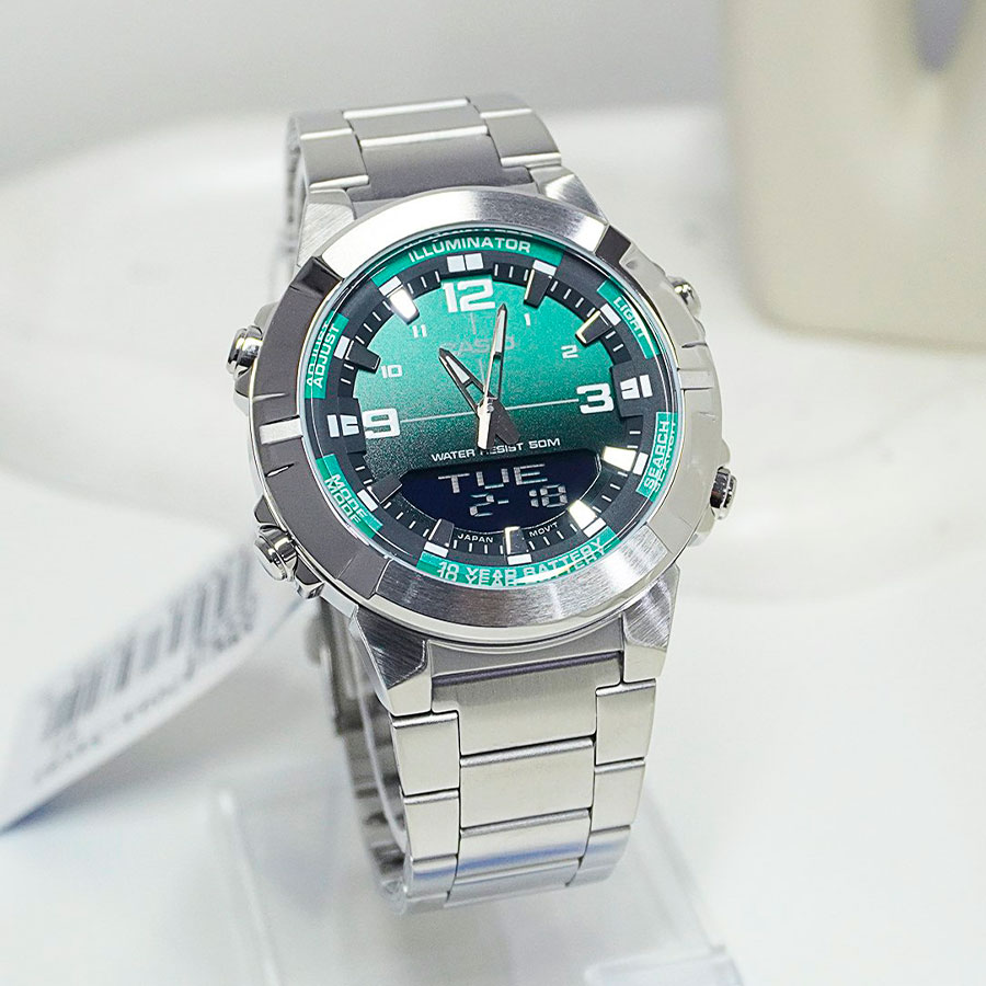 The Casio AMW‑870DA‑3A is a striking analog‑digital men’s watch that blends timeless design with practical everyday features. Its bold green‑accented dial and durable stainless steel case and bracelet make a stylish statement on the wrist, while dependable functions like world time, stopwatch, countdown timer, daily alarms, and a full auto‑calendar ensure you stay on schedule no matter where life takes you. With 50 m water resistance and a long‑lasting 10‑year battery, this timepiece delivers a perfect balance of style, functionality, and reliability for daily wear.