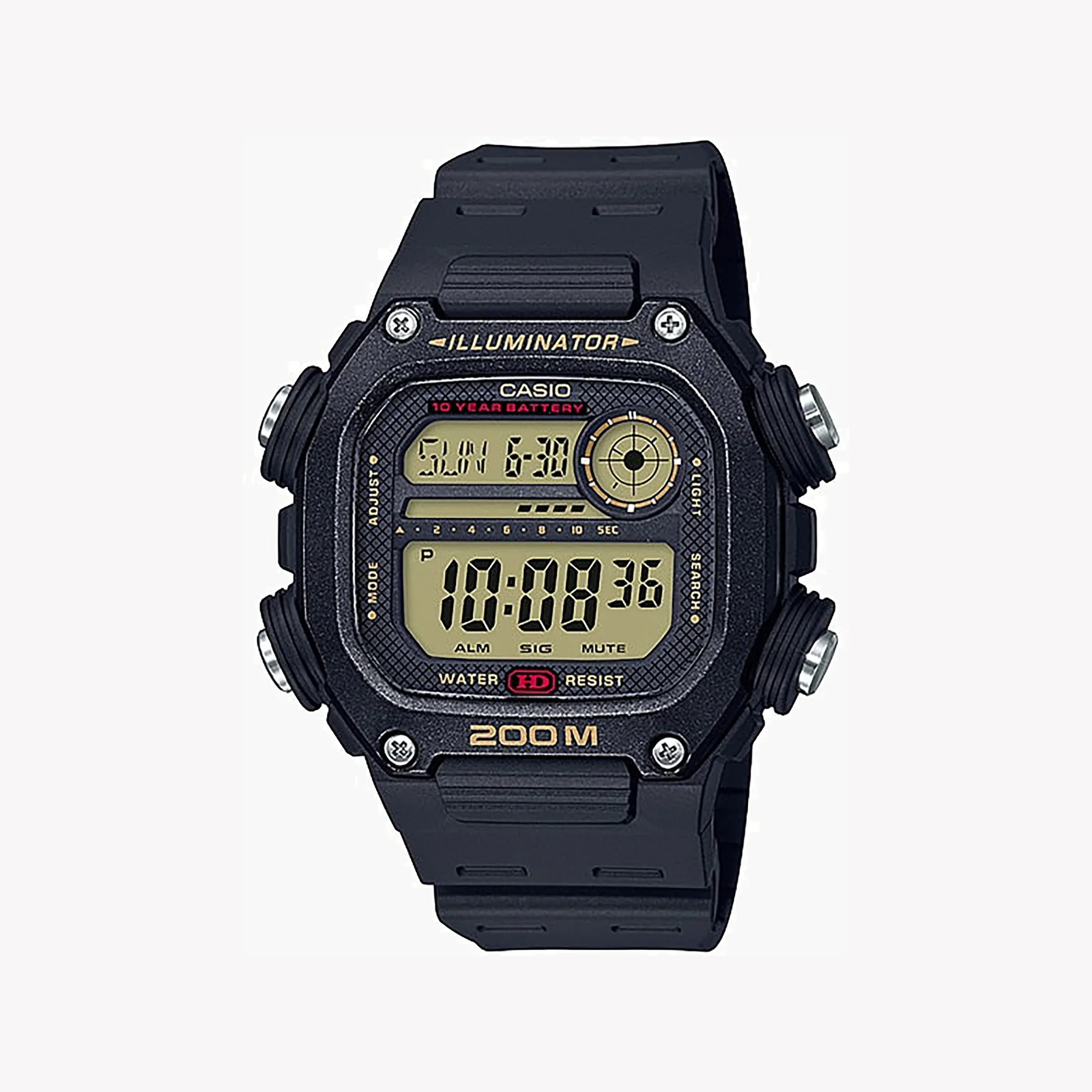 The CASIO DW291H-9A is a rugged digital watch that combines durable design with practical everyday features. Built with a tough resin case and band, this model offers excellent 200-metre water resistance and a 10-year battery life, making it ideal for sports, travel, outdoor adventures, and daily wear. Its bold digital display includes world time for global travellers, a precise stopwatch, countdown timer, multiple alarms, and a bright LED backlight — all designed for reliability and convenience wherever life takes you.