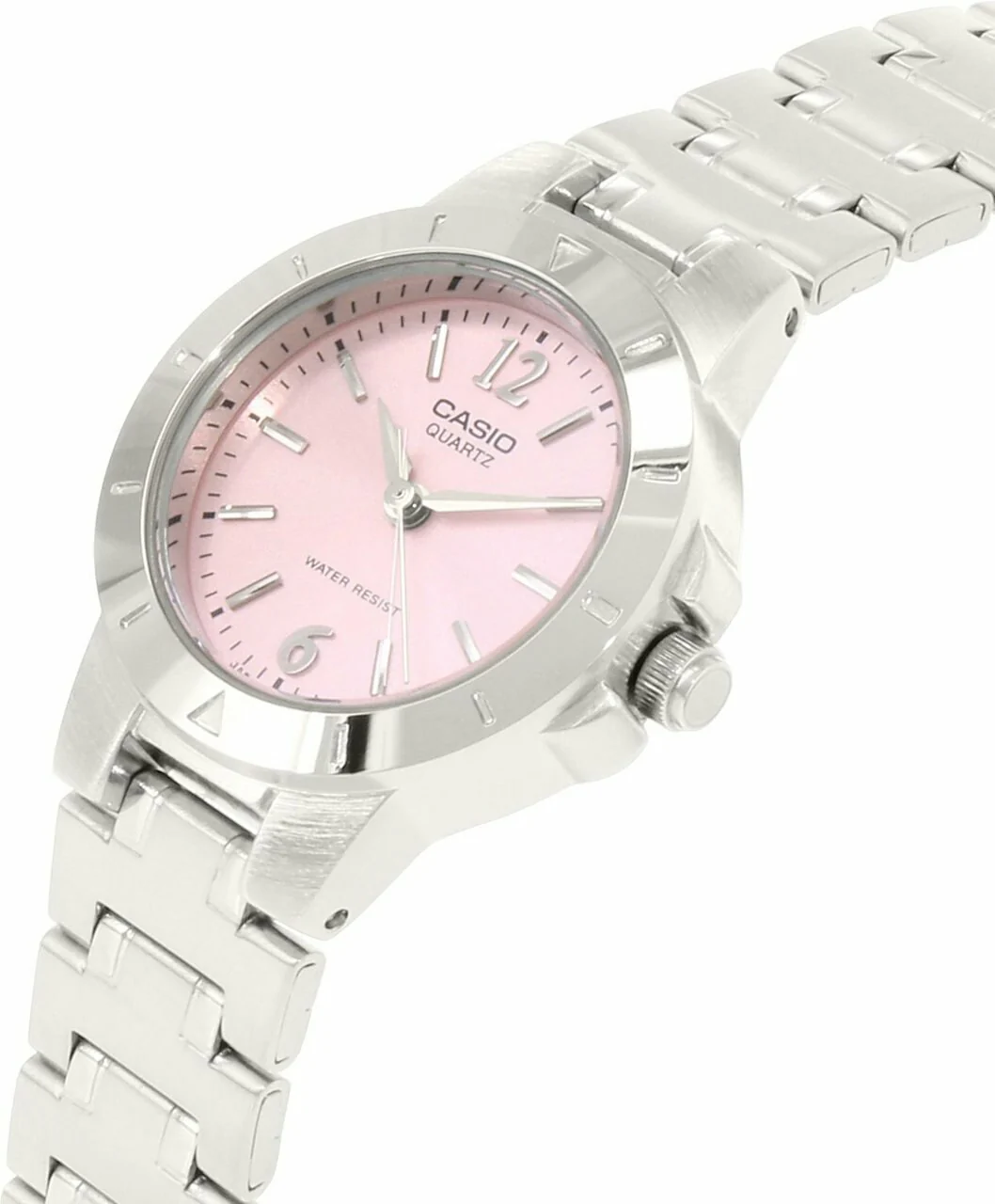 Add a soft, feminine touch to your everyday style with the CASIO LTP‑1177A‑4A1 in a charming pink shade. This ladies’ analog watch pairs classic design with a delicate pink dial that’s perfect for casual outings, school, work, or special occasions. Built with dependable Japanese quartz movement and a comfortable stainless‑steel bracelet, it offers both reliable timekeeping and stylish appeal.