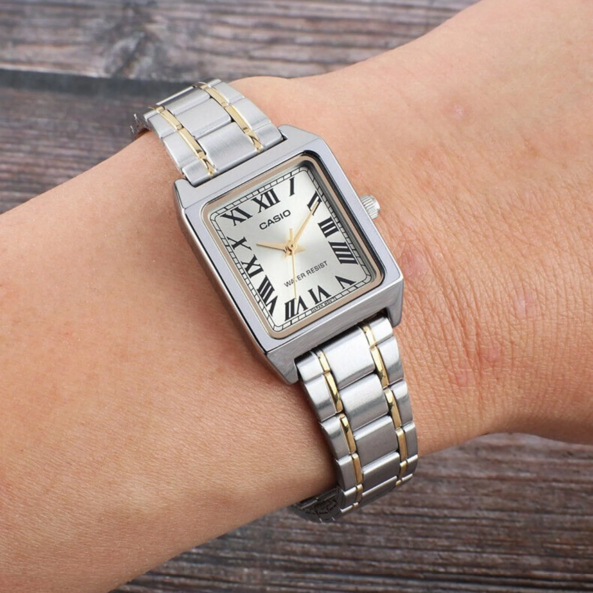 The CASIO LTP-V007SG-9B is an elegant and timeless analog wristwatch designed for everyday wear. With its sleek rectangular case and refined silver-tone stainless steel bracelet, this model combines classic style with reliable performance. The simple dial with clear markers ensures easy time reading, while the mineral glass and water resistance give everyday durability. Powered by a precise Japanese quartz movement, this watch offers dependable timekeeping and a comfortable fit for all occasions.