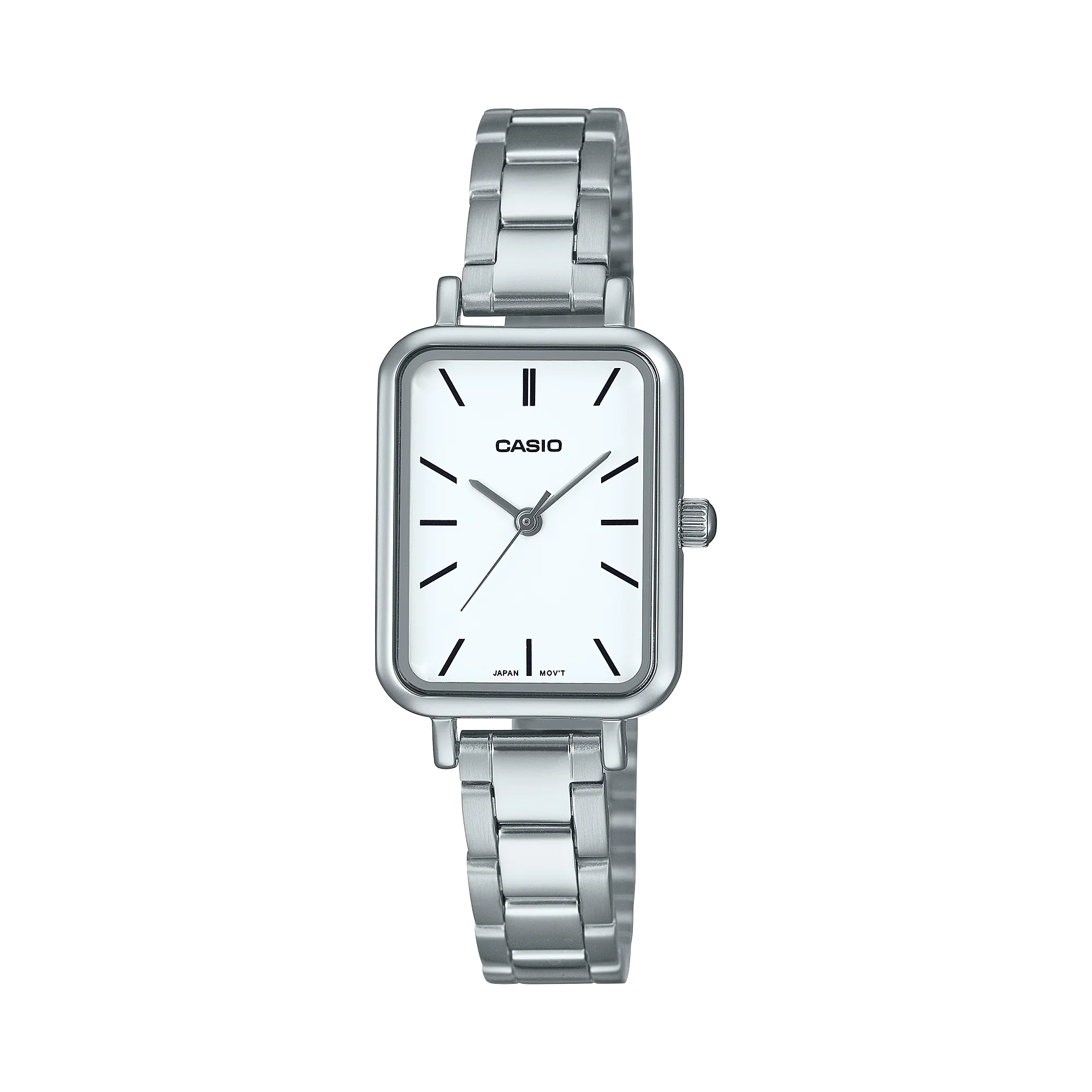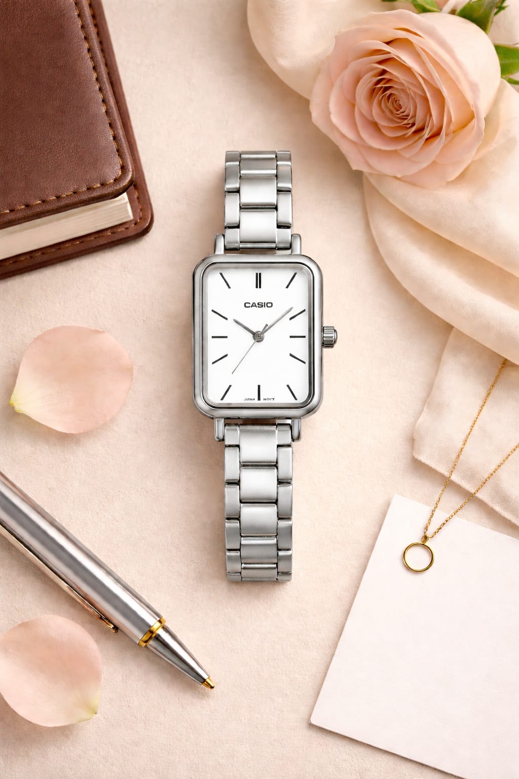 The CASIO LTP‑V009D‑7E is a classic and elegant women’s analog watch designed for everyday wear. With its white dial and silver stainless‑steel bracelet, it offers a refined, timeless look that’s easy to pair with both casual and formal outfits. Powered by a reliable quartz movement, it delivers accurate timekeeping with a simple three‑hand analog display (hour, minute, second). The minimalist design and durable construction make this watch a versatile accessory that’s perfect for daily use — whether you’re heading to school, work, or a casual outing. Built‑in water resistance means it can handle light splashes and rain, giving you peace of mind during everyday activities.