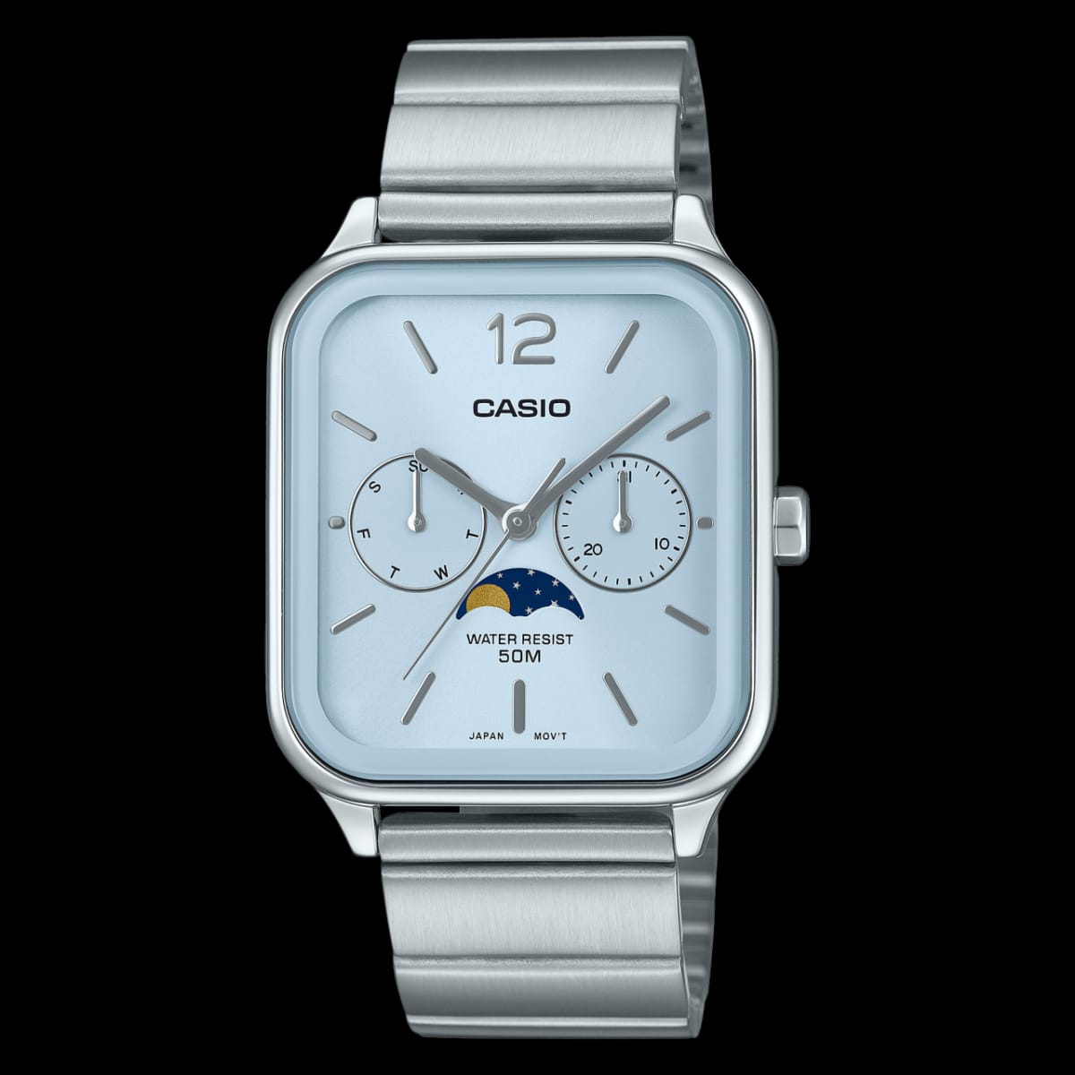 The Casio MTP‑M305D‑2A features a sleek sky blue dial paired with a durable stainless steel bracelet, offering a fresh and stylish look. With precise quartz movement, day/date functions, and 50‑meter water resistance, it’s the perfect watch for everyday elegance and casual sophistication.
