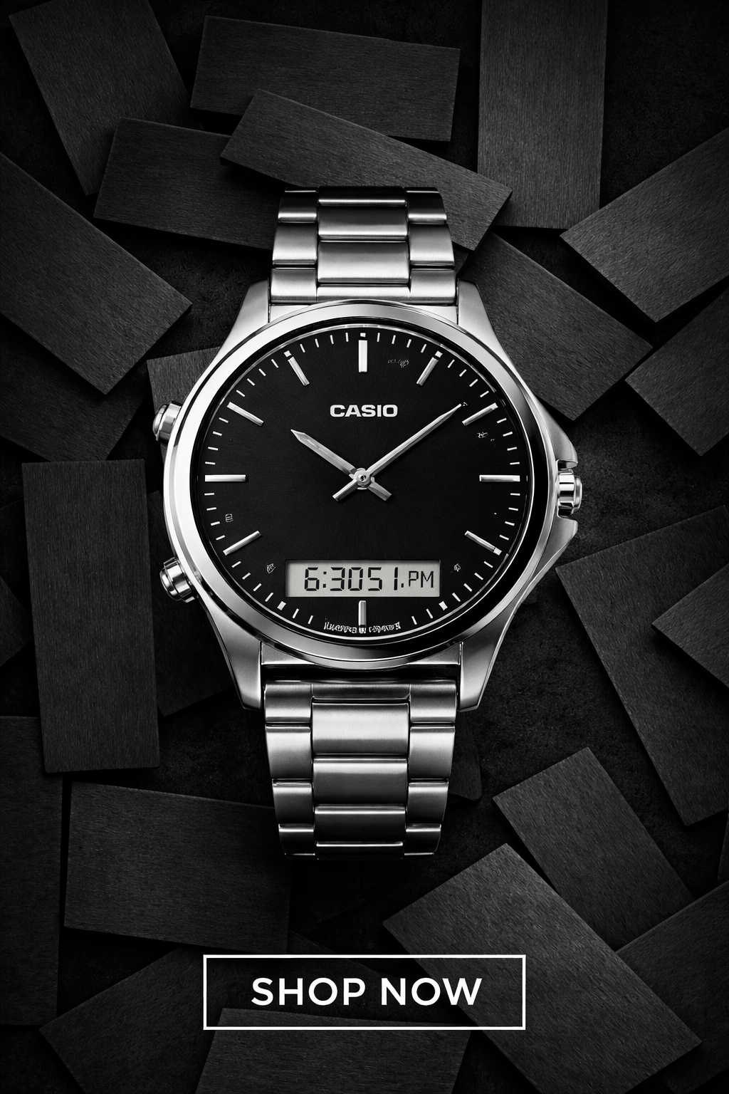 The CASIO MTP-VC01D-1E is a stylish and functional men’s analog-digital wristwatch that perfectly blends classic design with modern features. Its sleek black dial and stainless steel case give it a sophisticated look that’s ideal for both everyday wear and more formal occasions. Featuring both analog and digital timekeeping, this timepiece offers dual time functionality — perfect for travellers, professionals, or anyone who likes to keep track of two time zones at once. The integrated digital display also includes practical tools like a stopwatch, daily alarm, and auto-calendar, making it a versatile choice for daily use. Built with dependable Japanese quartz movement and protected by a durable mineral crystal, this watch delivers reliable performance with a timeless aesthetic.