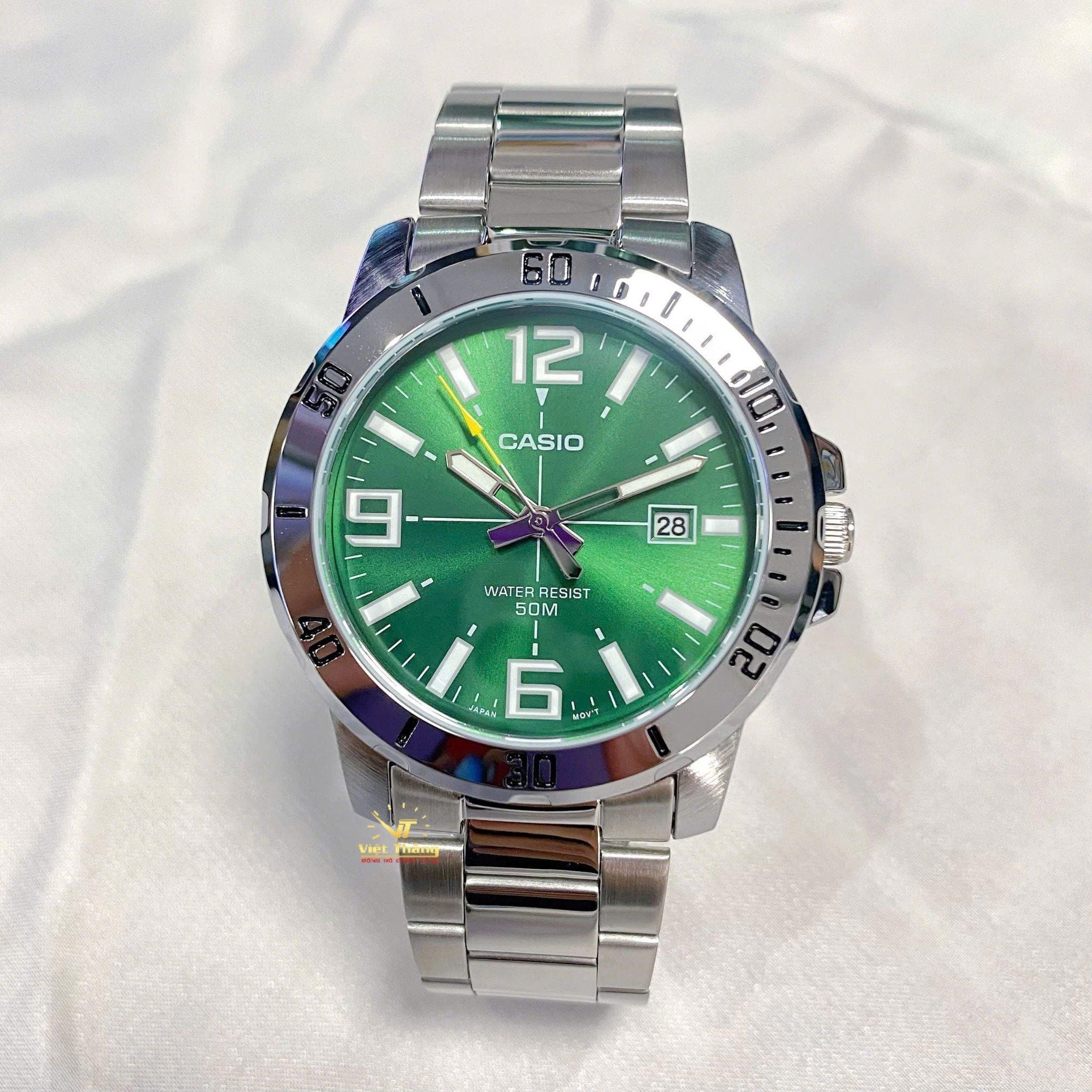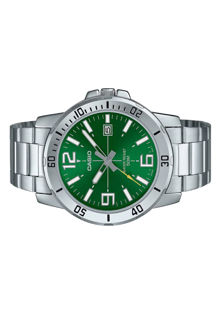 The CASIO MTP‑VD01D‑3B is a classic yet sporty analog men’s wristwatch with a bold green dial that stands out while still remaining versatile for both everyday and smarter looks. It’s crafted with a stainless steel case and bracelet that gives it a durable, premium feel and features a clear analog display with a date window for practical everyday use. With reliable quartz movement and 50‑meter water resistance, this timepiece combines everyday functionality with timeless style.