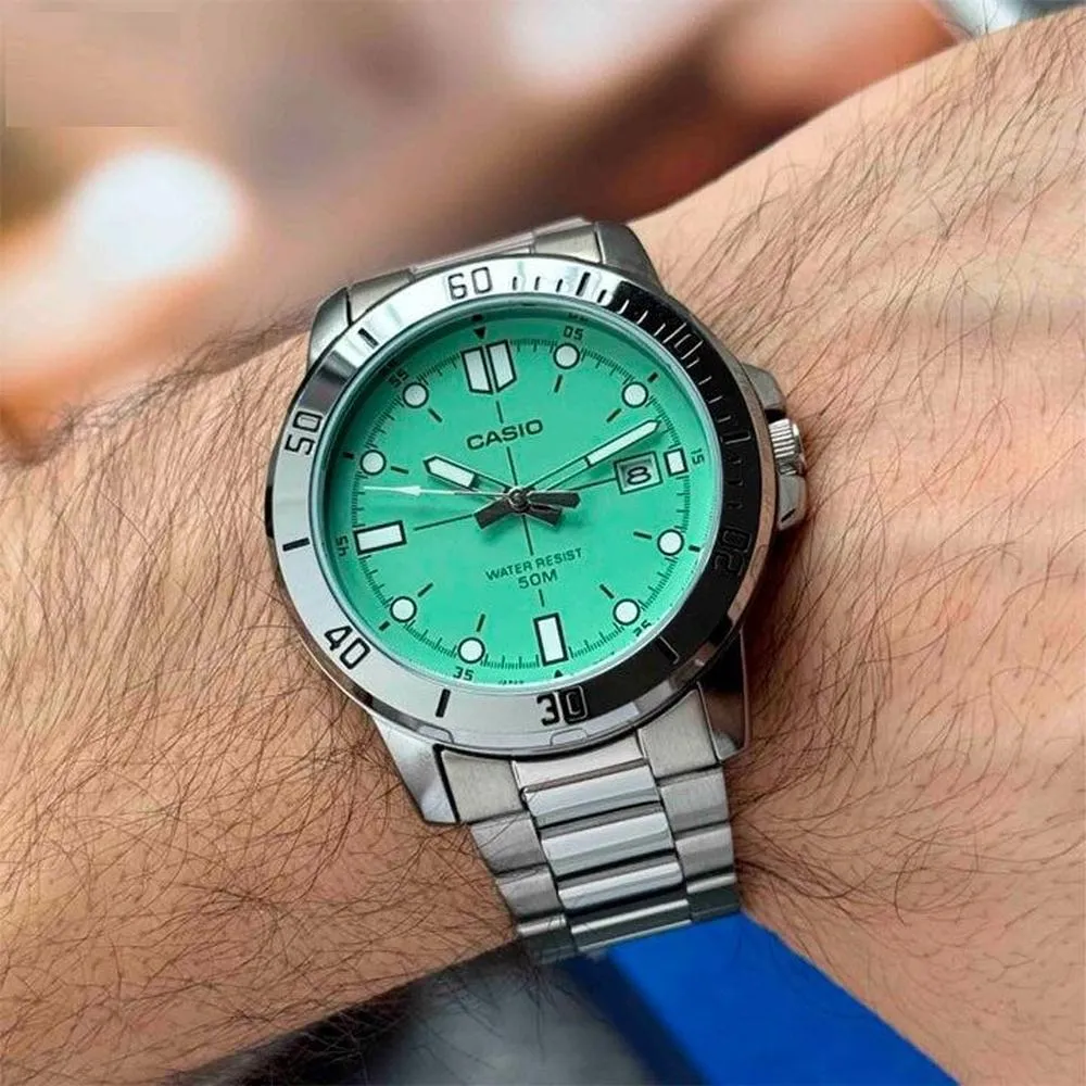 The CASIO MTP‑VD01D‑3E is a stylish and practical men’s analog watch designed for everyday wear. Featuring a mint‑green dial that adds a fresh and eye‑catching look, this timepiece pairs perfectly with a sleek silver stainless‑steel bracelet, making it suitable for both casual and formal occasions. The easy‑to‑read display includes a date window, reliable quartz movement, and durable components — ensuring dependable performance and classic style. Water resistant up to 50 meters, it handles daily splashes and rain with ease.