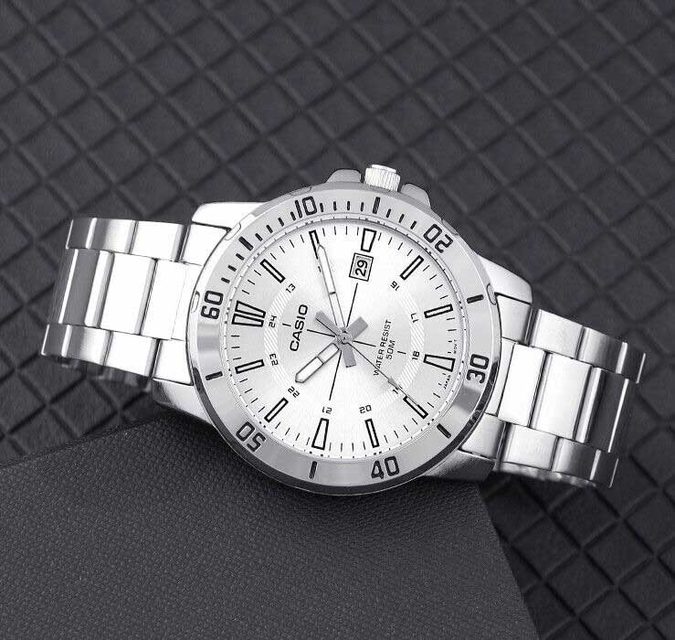 The CASIO MTP‑VD01D‑7C is a versatile, everyday men’s analog wristwatch that combines classic design with lasting functionality. Featuring a clean silver dial framed by a stainless steel case and bracelet, it brings a sleek yet sporty look that pairs effortlessly with both casual and formal outfits. The watch includes a date display at the 3 o’clock position and is powered by a reliable quartz movement, making it an excellent everyday timepiece with dependable performance. Its 50 m water resistance means you can wear it through splashes and rain without worry.