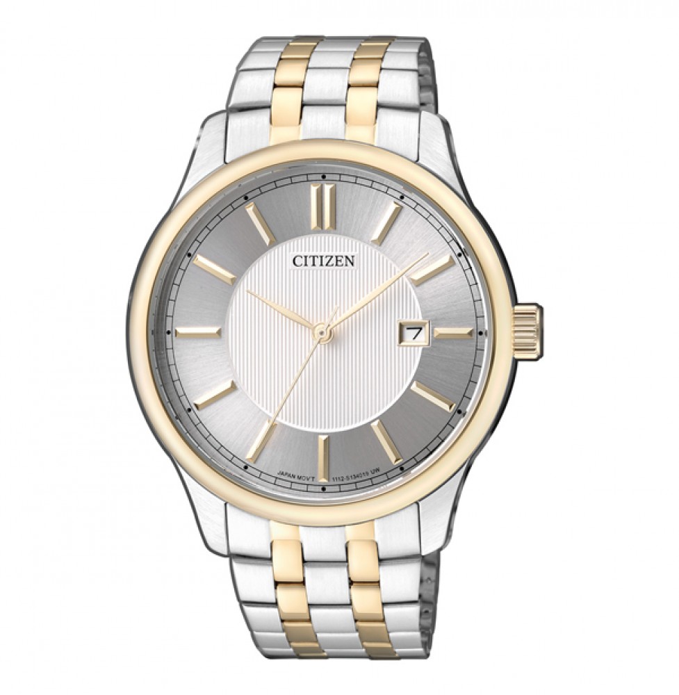 The CITIZEN BI1054-55A exudes elegance with its white dial and two-tone stainless steel case. This 41mm timepiece offers a classic design, a date display, and 50-meter water resistance, making it a versatile watch for any occasion.