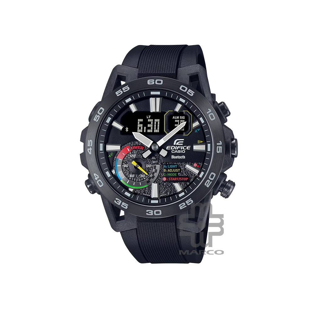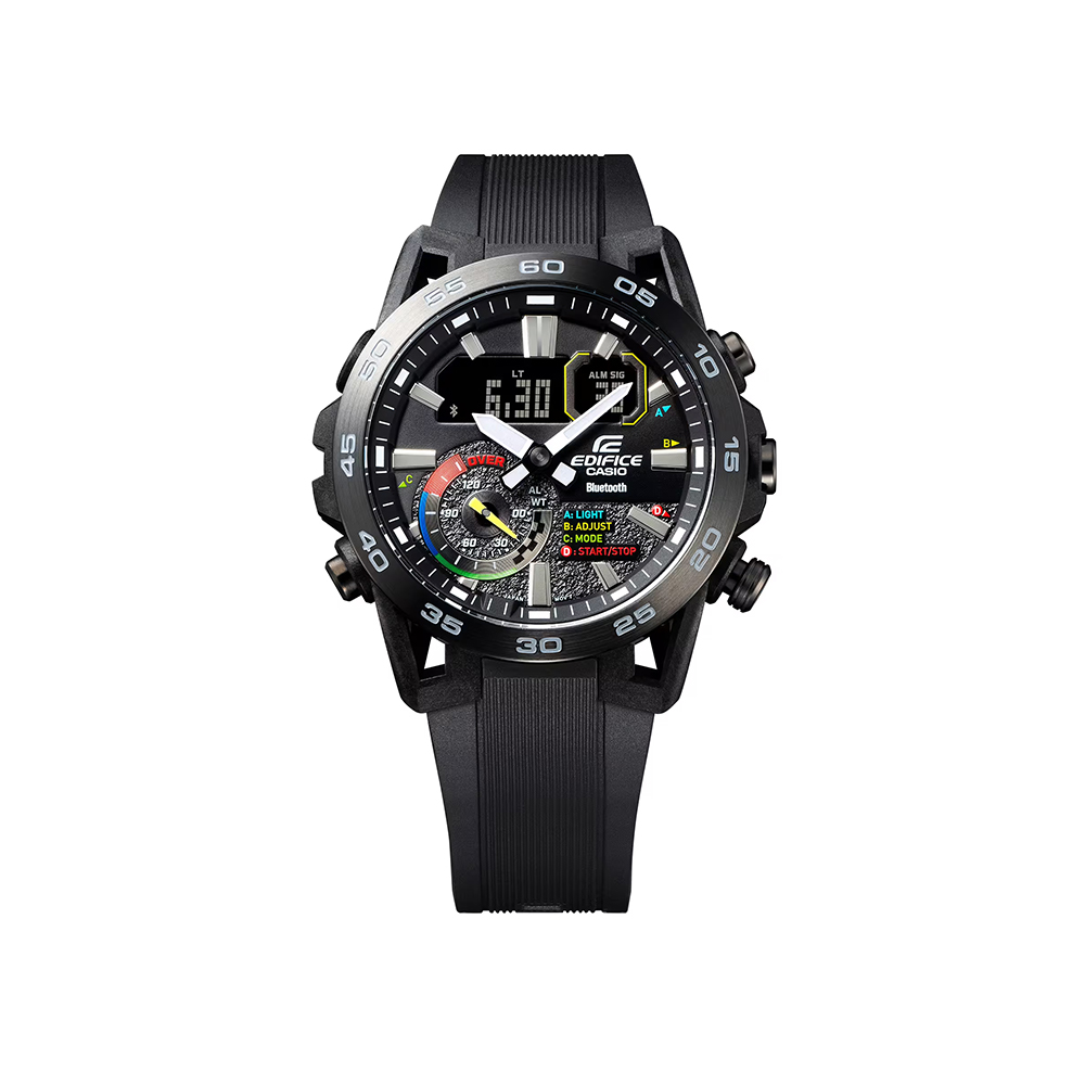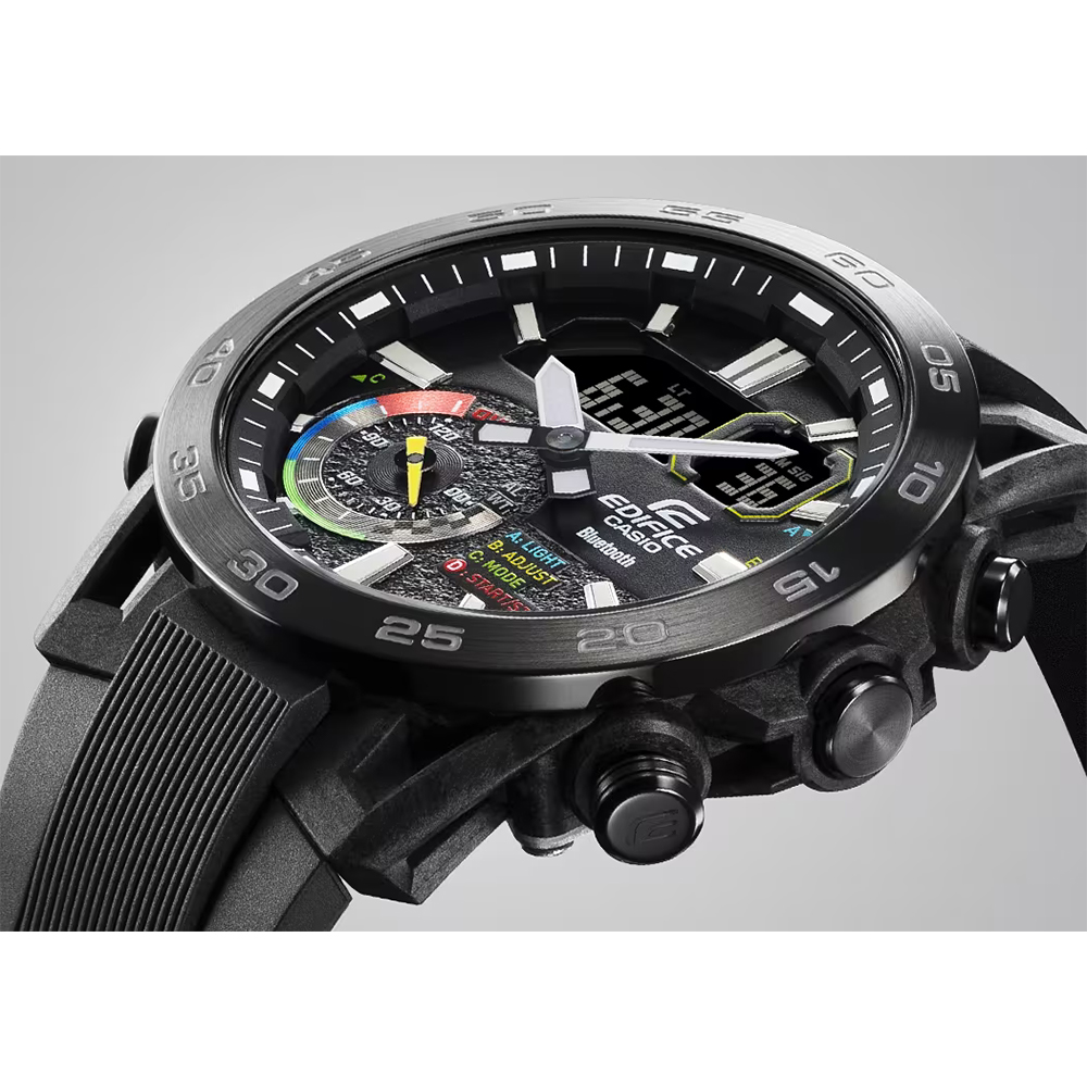 The Casio EDIFICE ECB‑40MP‑1A is a racing‑inspired analog‑digital chronograph from the EDIFICE SOSPENSIONE series designed for motorsports and everyday performance. Its bold black dial with multicolor accents is inspired by the push‑button controls and steering wheels of race cars, enhancing visibility and sporty style. Equipped with Bluetooth® smartphone connectivity, the watch syncs with the CASIO WATCHES app for automatic time adjustment, world time management, stopwatch data transfer, and a schedule timer that shows calendar event start/end times on the display. A comfortable soft urethane (resin) band, dual LED illumination, and 100 m water resistance make this model a practical choice for daily wear and active use.