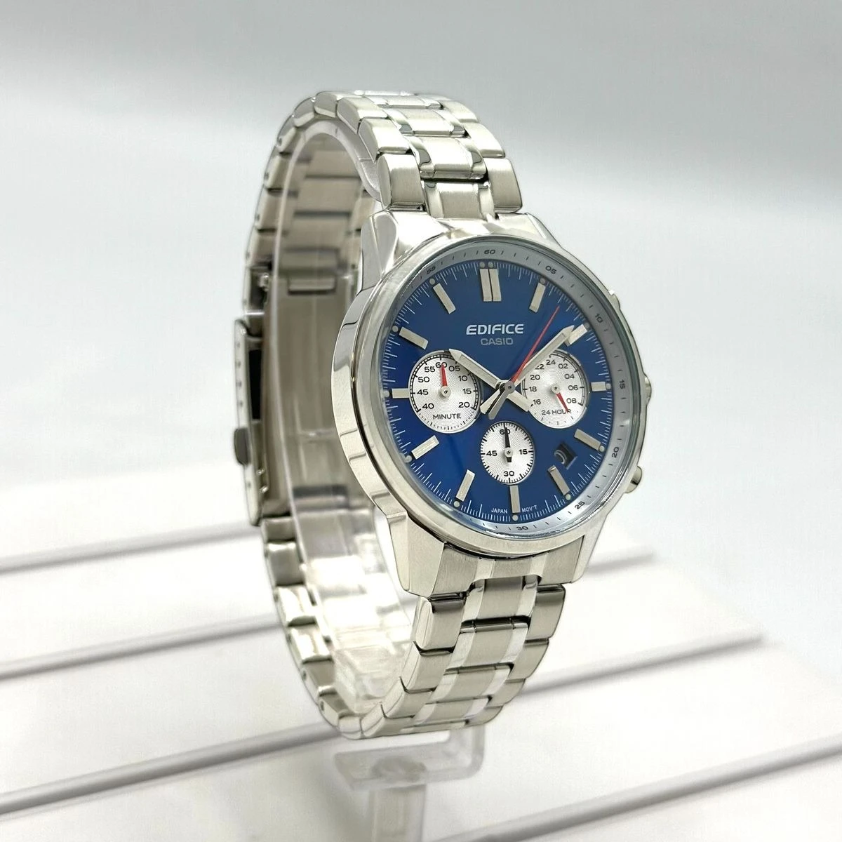 The Casio EDIFICE EFR575D‑2A is a sporty analog chronograph from Casio’s EDIFICE lineup, inspired by the look of classic sports‑car instrument panels with a bold blue two‑tone dial that contrasts the sub‑dials for clear readability. Housed in a stainless‑steel case and bracelet, it features a 1‑second stopwatch, date display, and 100 m water resistance, making it both stylish and functional for daily wear. The convex (spherical) mineral glass enhances visibility and gives the watch a refined look that works equally well with casual and formal attire.