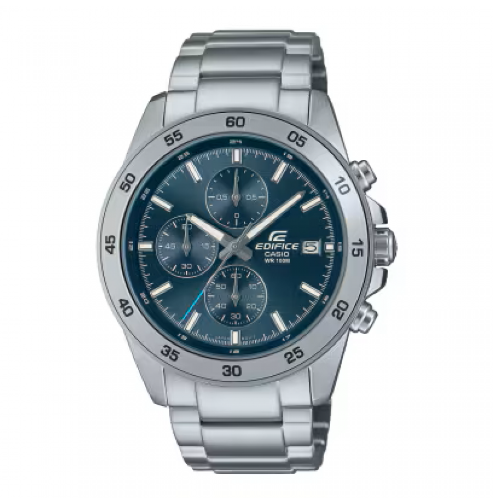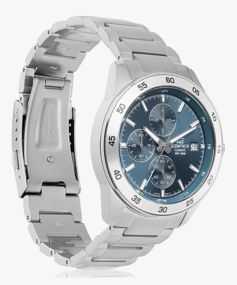 The Casio Edifice EFR526D-2A is a dynamic men’s chronograph that blends refined design with practical performance. Featuring a striking blue dial housed in a polished stainless-steel case and matched with a robust metal bracelet, this watch offers a sporty yet sophisticated look ideal for daily wear, business occasions, or weekend style. The clear analog layout includes sub-dials for stopwatch functions and a date window for added convenience. Built with reliable quartz movement and water resistance up to 100 meters, the EFR526D-2A combines rugged durability with sleek Edifice styling.