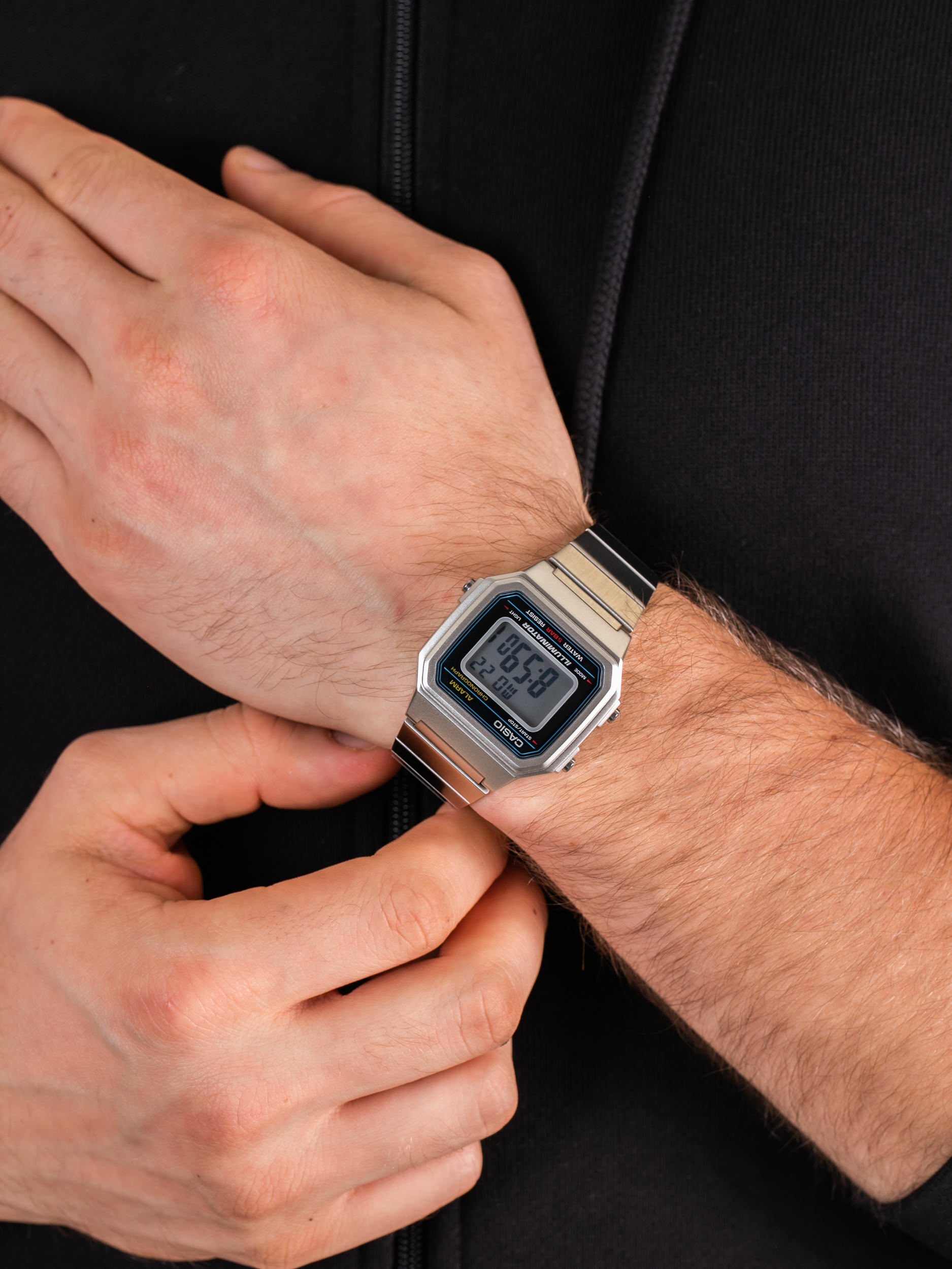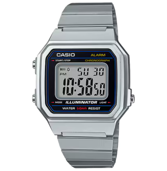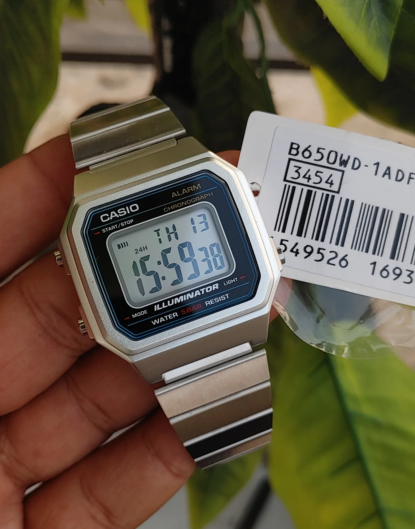The CASIO B650WD-1A is a sleek digital watch from Casio’s vintage lineup featuring a classic retro look with modern functionality. It sports a stainless steel band and clear digital display with large digits, making it perfect for everyday wear. The watch includes practical features like an LED backlight, stopwatch, daily alarm, and reliable long battery life — all in a lightweight, water-resistant design.