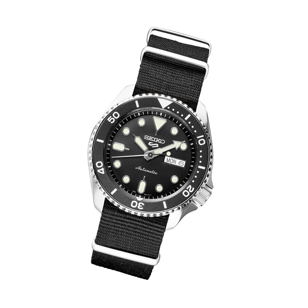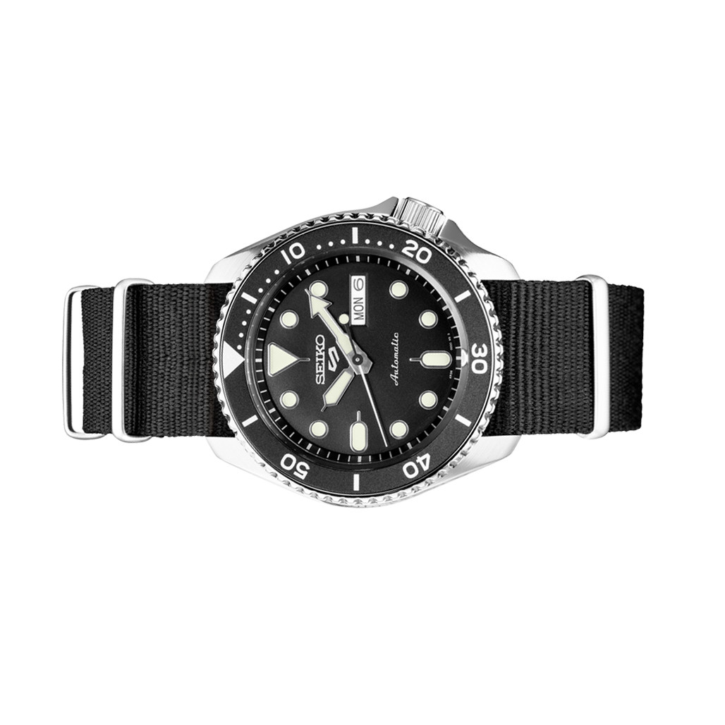 The Seiko 5 Sports SRPD89 features a bold black dial with a rugged nylon strap, delivering a clean and sporty everyday look. Built for durability and comfort, this watch is perfect for daily wear with a strong wrist presence.