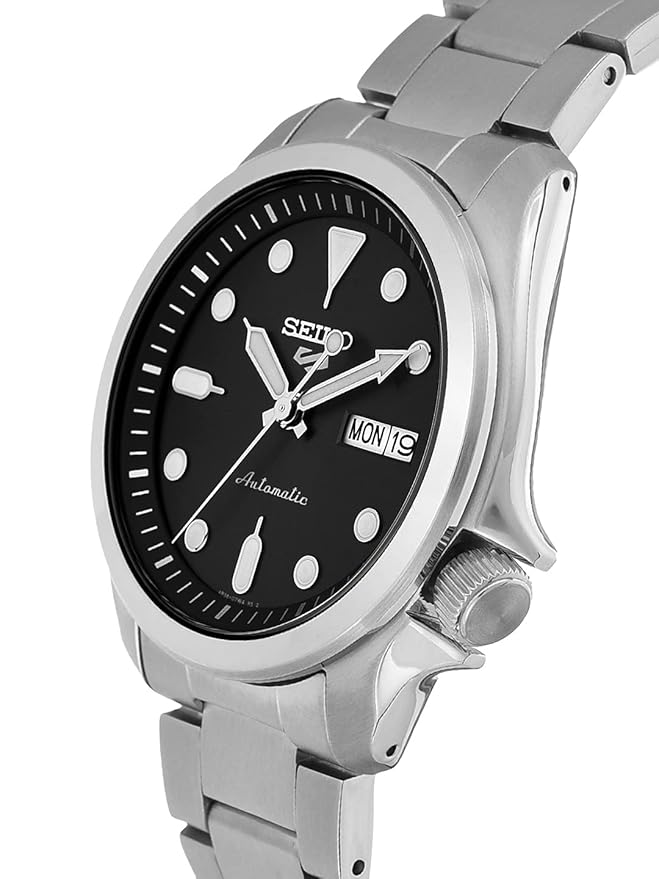 A versatile automatic watch featuring a classic black dial with a smooth bezel and stainless steel bracelet. The SRPE55K1 offers a perfect balance of sporty and formal styling, powered by Seiko’s reliable automatic movement—ideal for everyday wear.