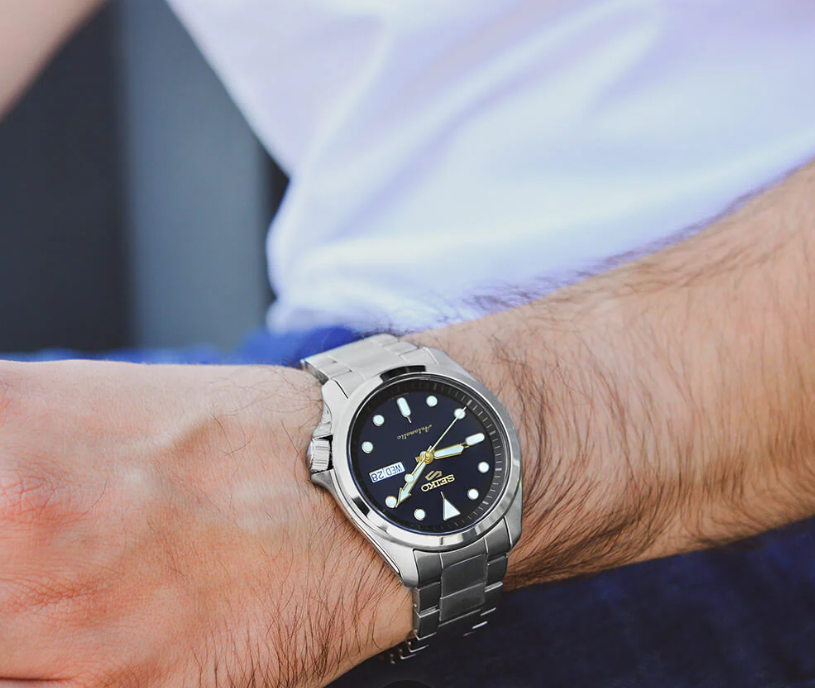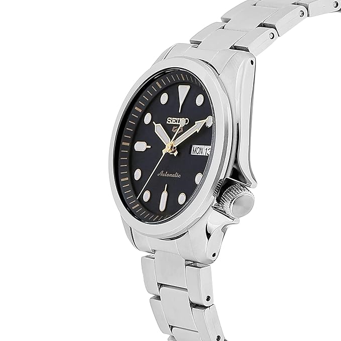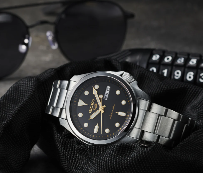 A stylish and versatile automatic watch featuring a black dial with gold-tone hands and markers, paired with a stainless steel bracelet. The SRPE57K1 blends sporty durability with a refined look, making it perfect for both casual and formal wear.