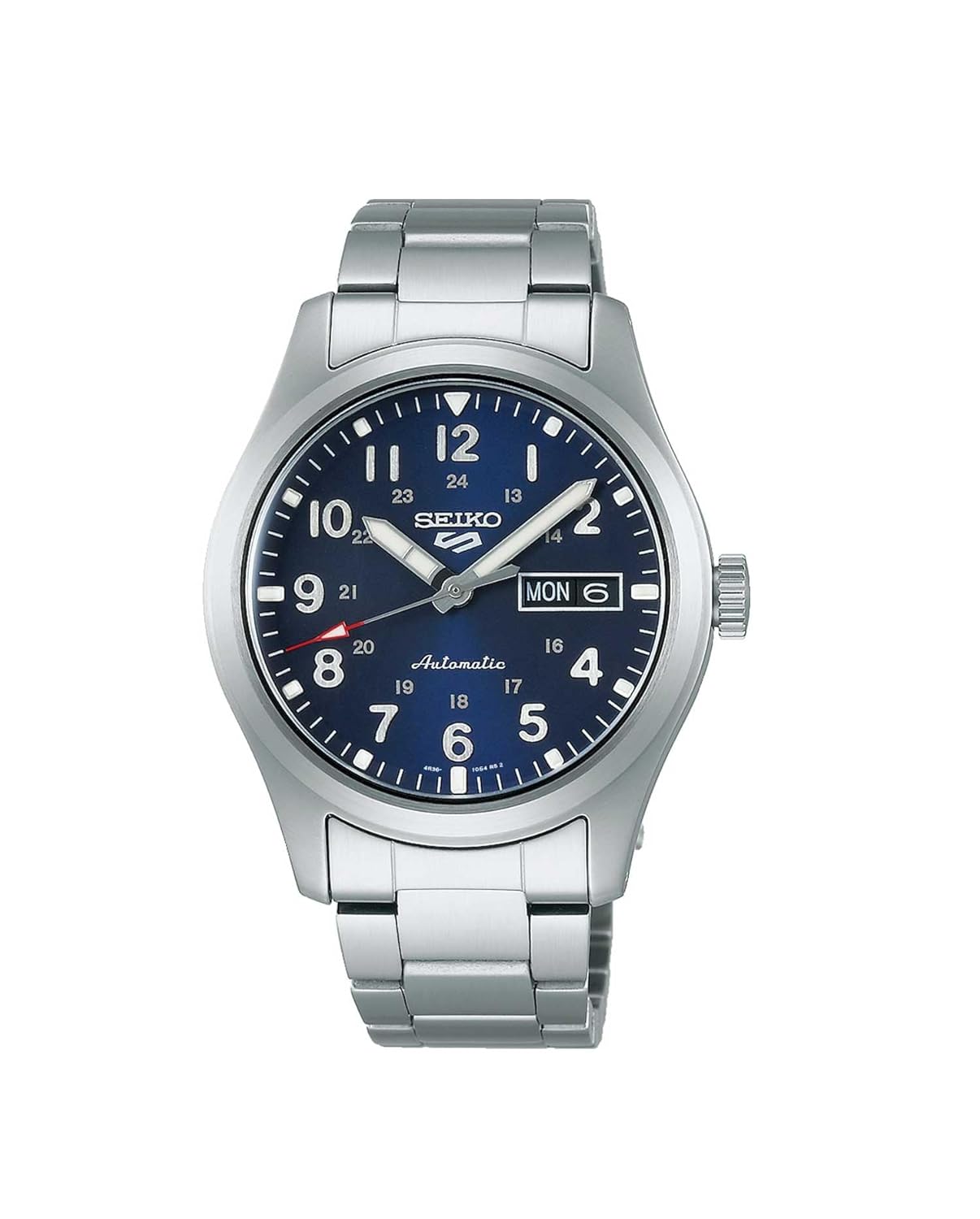 A rugged field-style automatic watch featuring a deep blue dial with full Arabic numerals and stainless steel bracelet. The SRPG29K1 is inspired by military trench watches, offering excellent readability, durability, and everyday versatility.