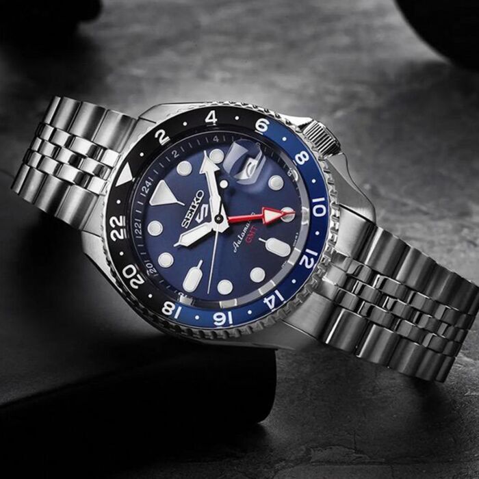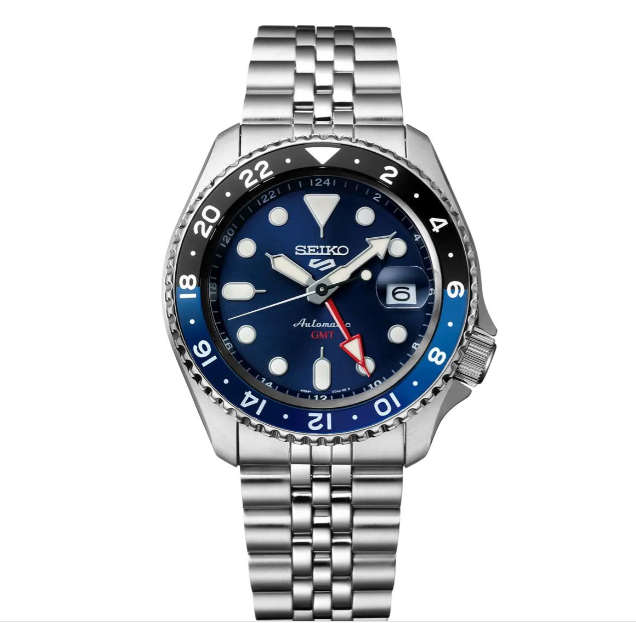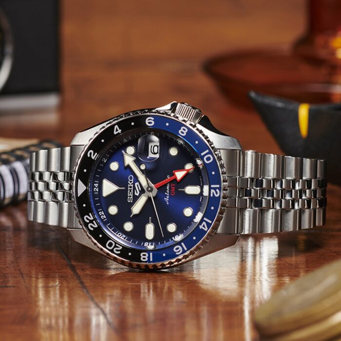 A bold and eye-catching Seiko 5 Sports SSK003K1 featuring a deep blue sunburst dial with a black & blue “Blueberry” GMT bezel. Designed for travelers, it includes a red GMT hand to track a second time zone, combined with Seiko’s reliable automatic movement and iconic SKX-inspired design.
