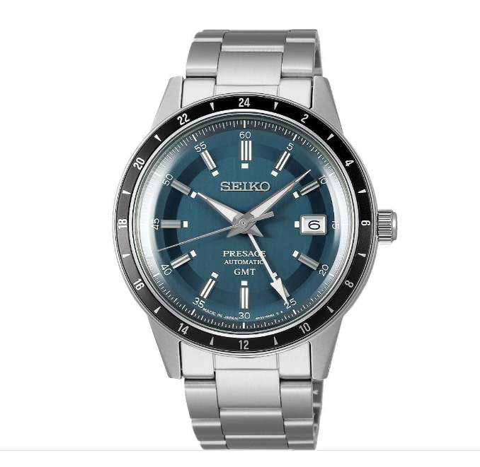 A refined and elegant automatic GMT watch featuring a petrol blue dial with vintage “Style 60s” design. The SSK009J1 combines classic Presage aesthetics with modern dual-time functionality, making it perfect for both formal and everyday wear.