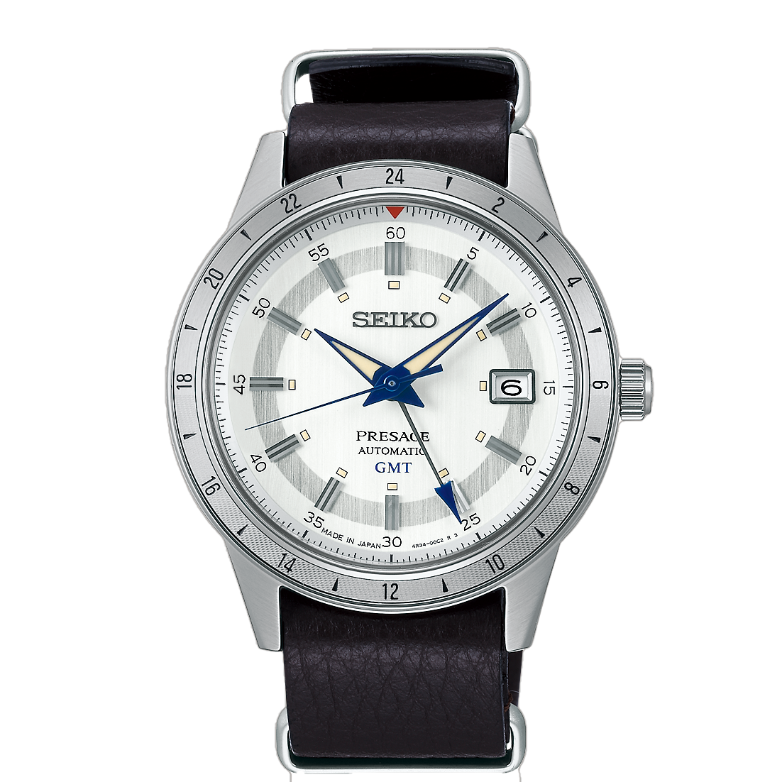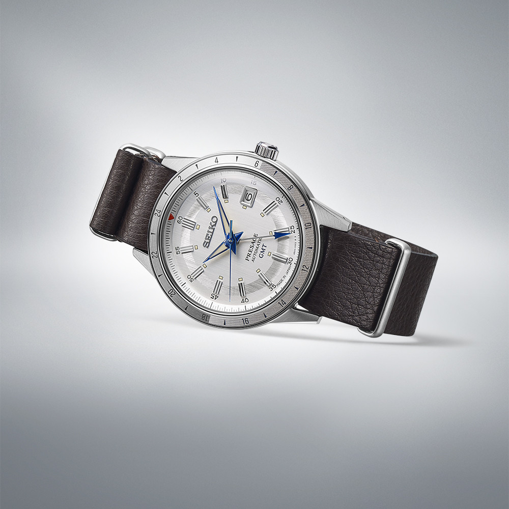A premium Seiko Presage SSK015J1 featuring a white/silver dial with vintage “Style 60s” design and brown leather strap. This limited edition GMT watch combines classic elegance with dual-time functionality, making it perfect for formal and refined everyday wear.