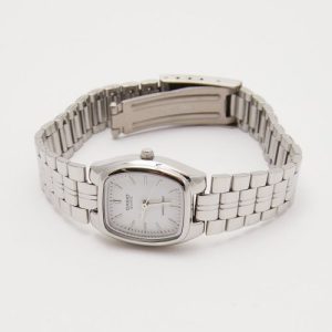 The Casio LTP-1169D-7A is an elegant ladies analog watch designed with a slim rectangular case and a classic stainless-steel bracelet. Its clean white dial with simple hour markers gives it a timeless look that matches both casual and formal outfits. Powered by reliable quartz movement, the watch delivers accurate timekeeping with minimal maintenance. The durable mineral glass protects the dial from scratches, while the lightweight stainless-steel band ensures comfortable everyday wear.