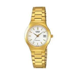 The Casio LTP‑1170N‑7A is an elegant ladies’ analog watch featuring a gold-tone stainless-steel case and bracelet with a clean white dial. Powered by precise quartz movement, it includes a convenient date display, durable mineral glass, and water-resistant construction. Its slim and classic design makes it ideal for everyday wear as well as formal occasions.