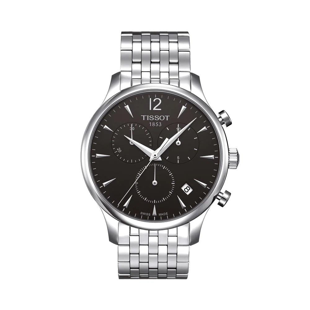The Tissot Tradition Chronograph T0636171106700 is a refined Swiss-made men’s watch featuring a striking black dial with chronograph functionality and timeless classic styling. Part of the Tissot Tradition collection, it combines vintage-inspired design with modern precision, ideal for business or formal wear.