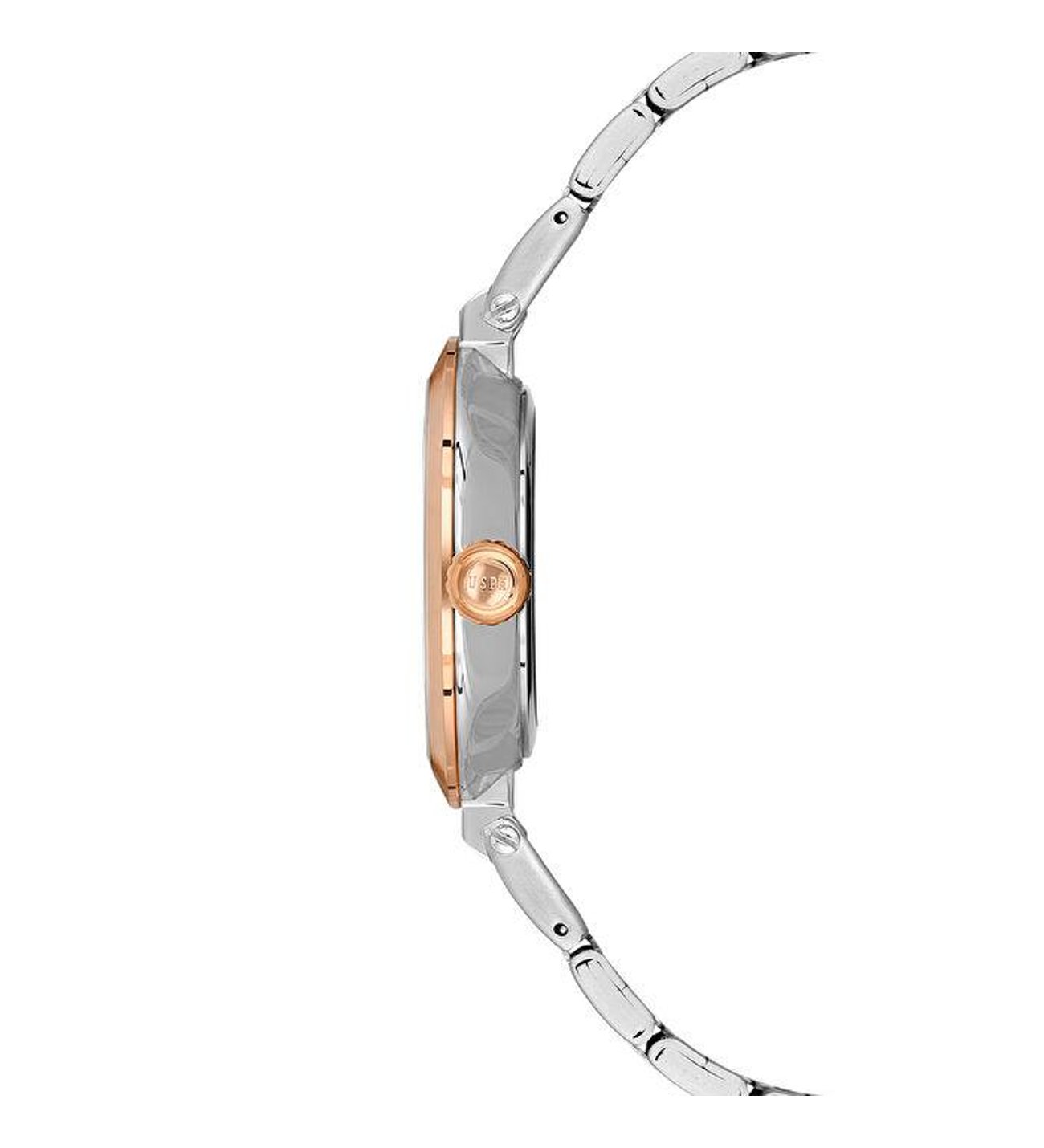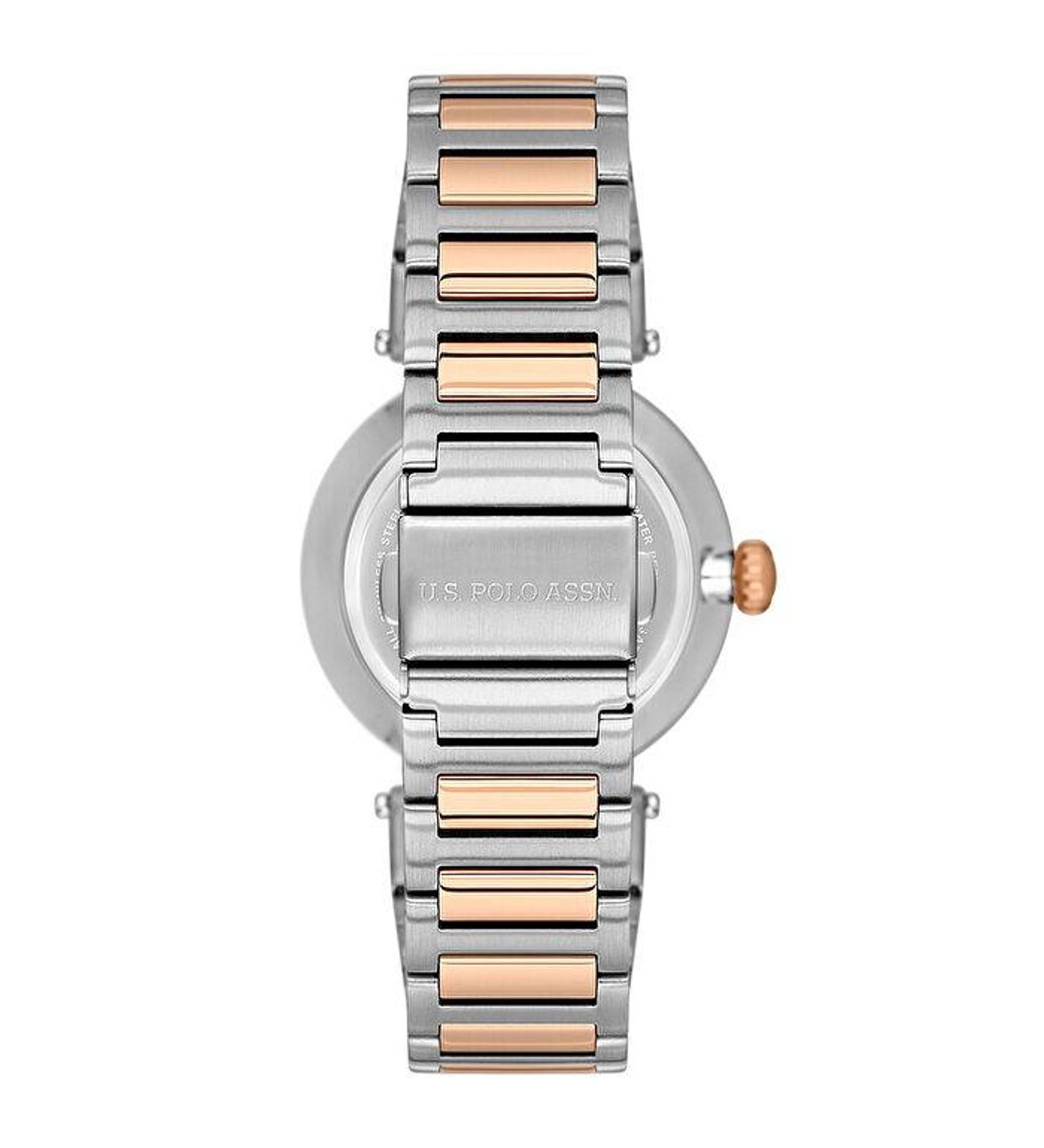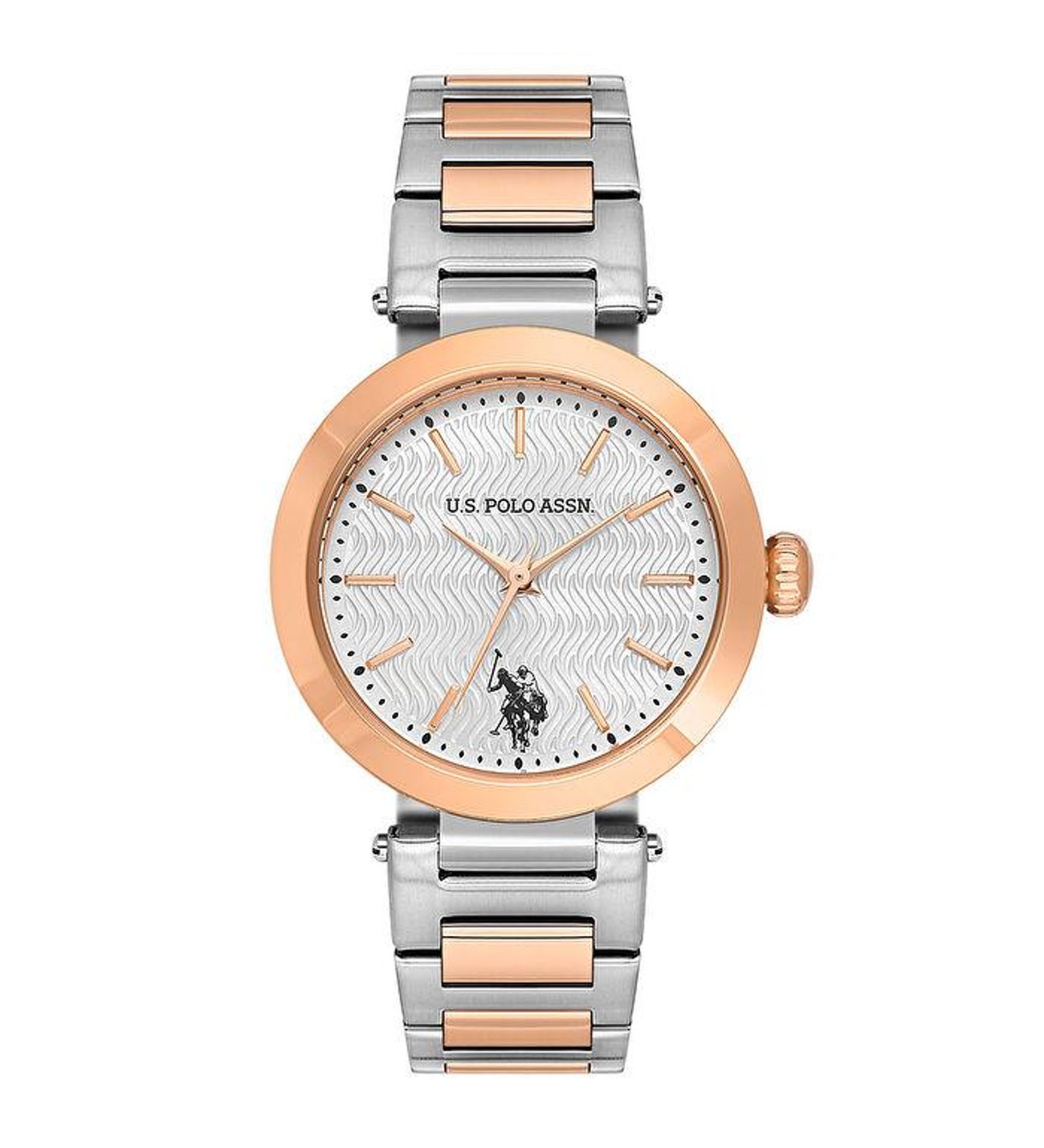 The U.S. Polo Assn. A2099-02 is a classy ladies’ watch featuring a metallic silver dial paired with a stylish two-tone (silver & rose gold) stainless steel bracelet. Designed with a minimal and elegant look, it is perfect for both daily wear and formal occasions.