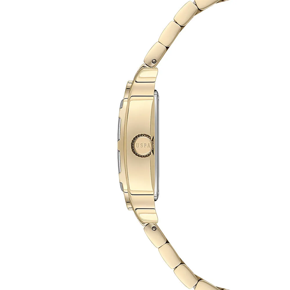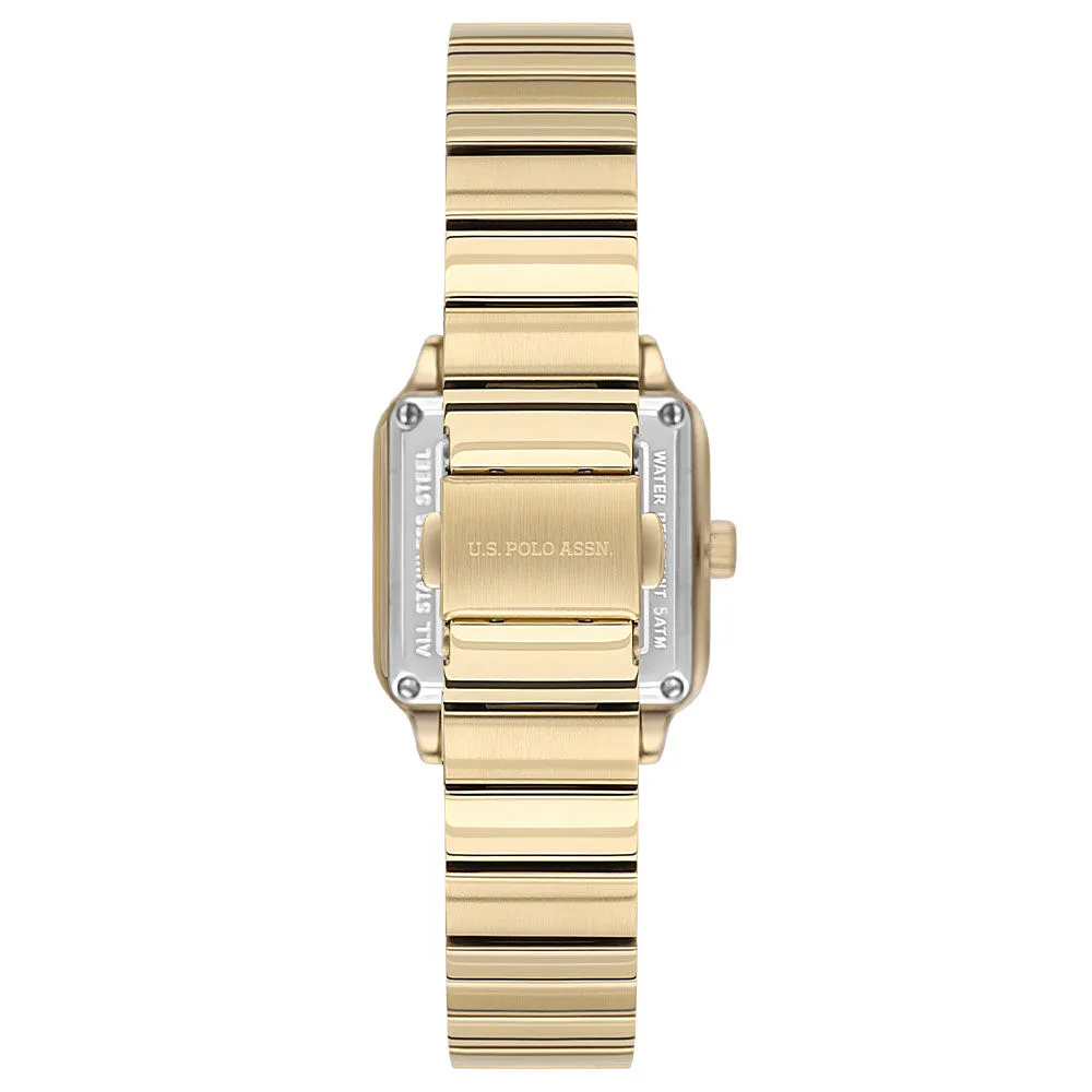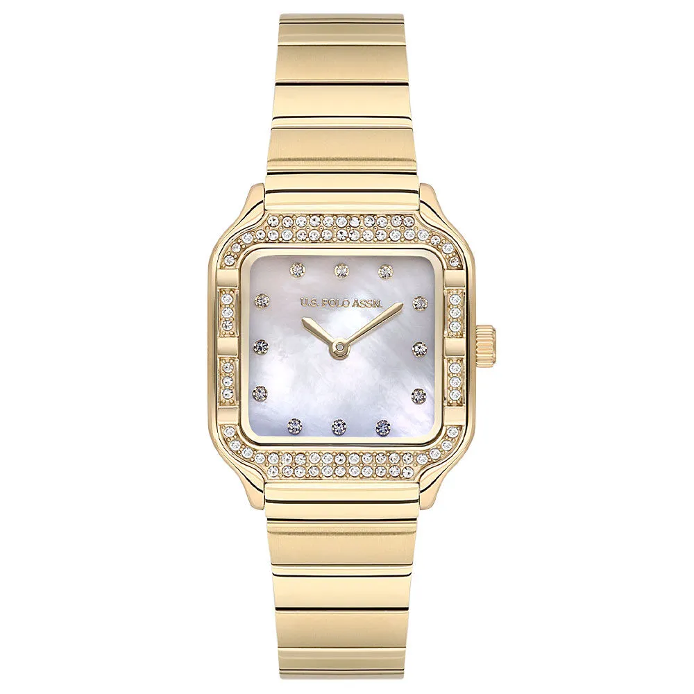 The U.S. Polo Assn. A2100-03 is a premium ladies’ watch featuring a unique square case design with a luxurious gold-tone stainless steel finish. The elegant mother-of-pearl dial with subtle detailing adds a sophisticated and feminine touch, making it perfect for both daily wear and special occasions.