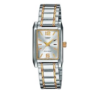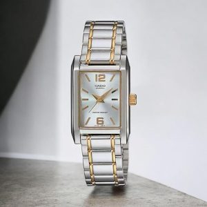 A timeless vintage-style ladies watch featuring a rectangular case and elegant two-tone (silver & gold) stainless steel bracelet. Its minimalist silver dial and slim profile make it perfect for formal wear, office style, and everyday elegance.