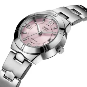 A stylish and elegant ladies watch featuring a soft pink dial with a sleek stainless steel bracelet. Its simple design with a date display makes it perfect for everyday wear, office use, and casual occasions.